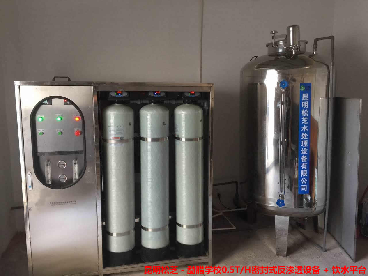 勐臘學校密封式0.5T/H反滲透設備 + 預處理系統(tǒng) + 飲水平臺